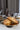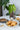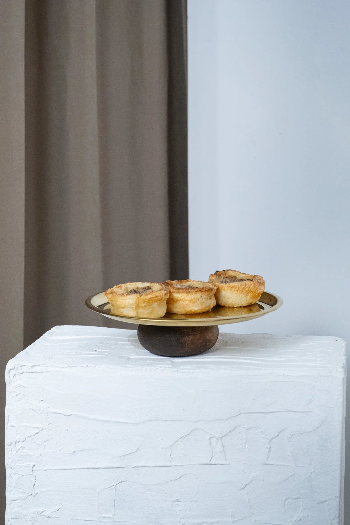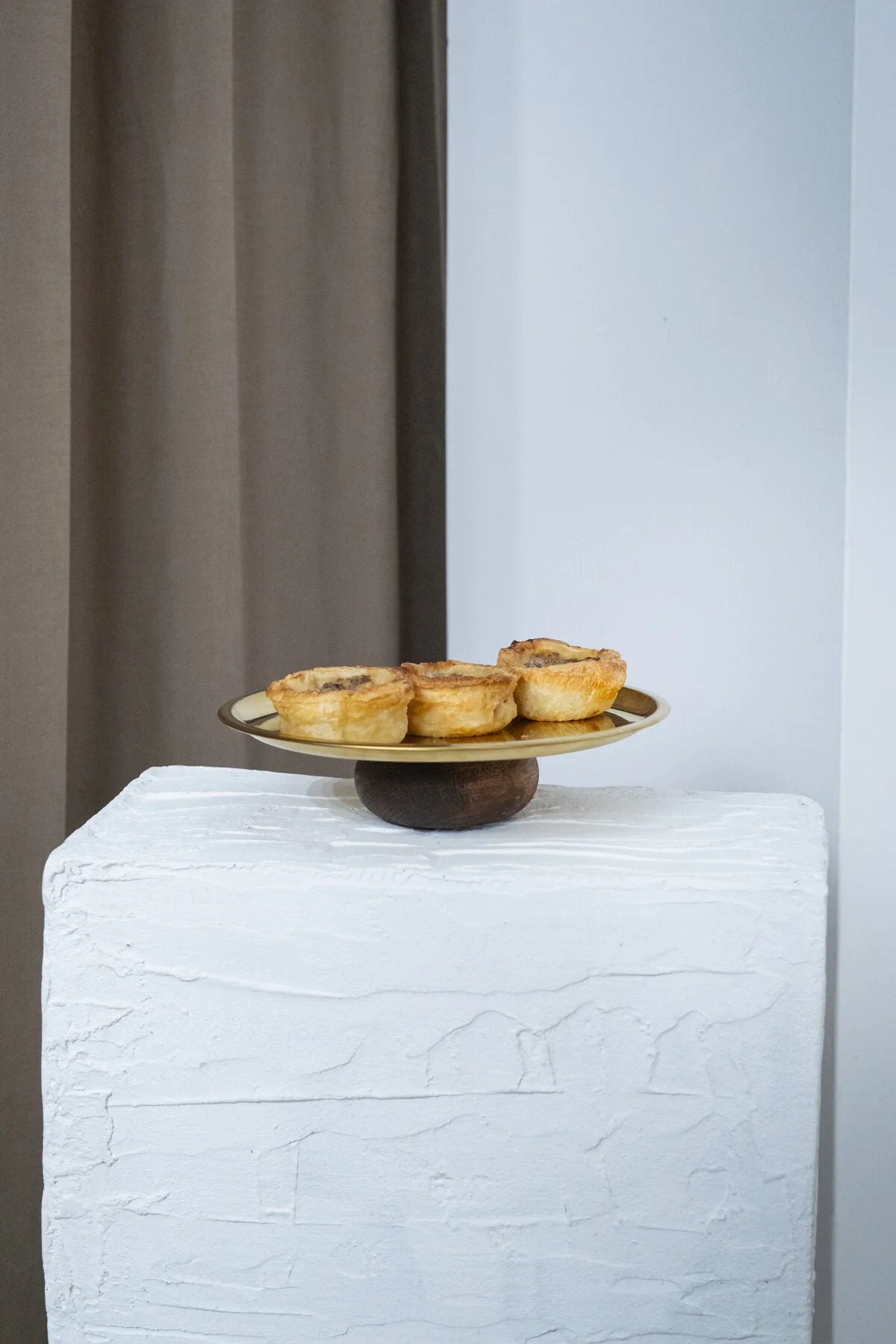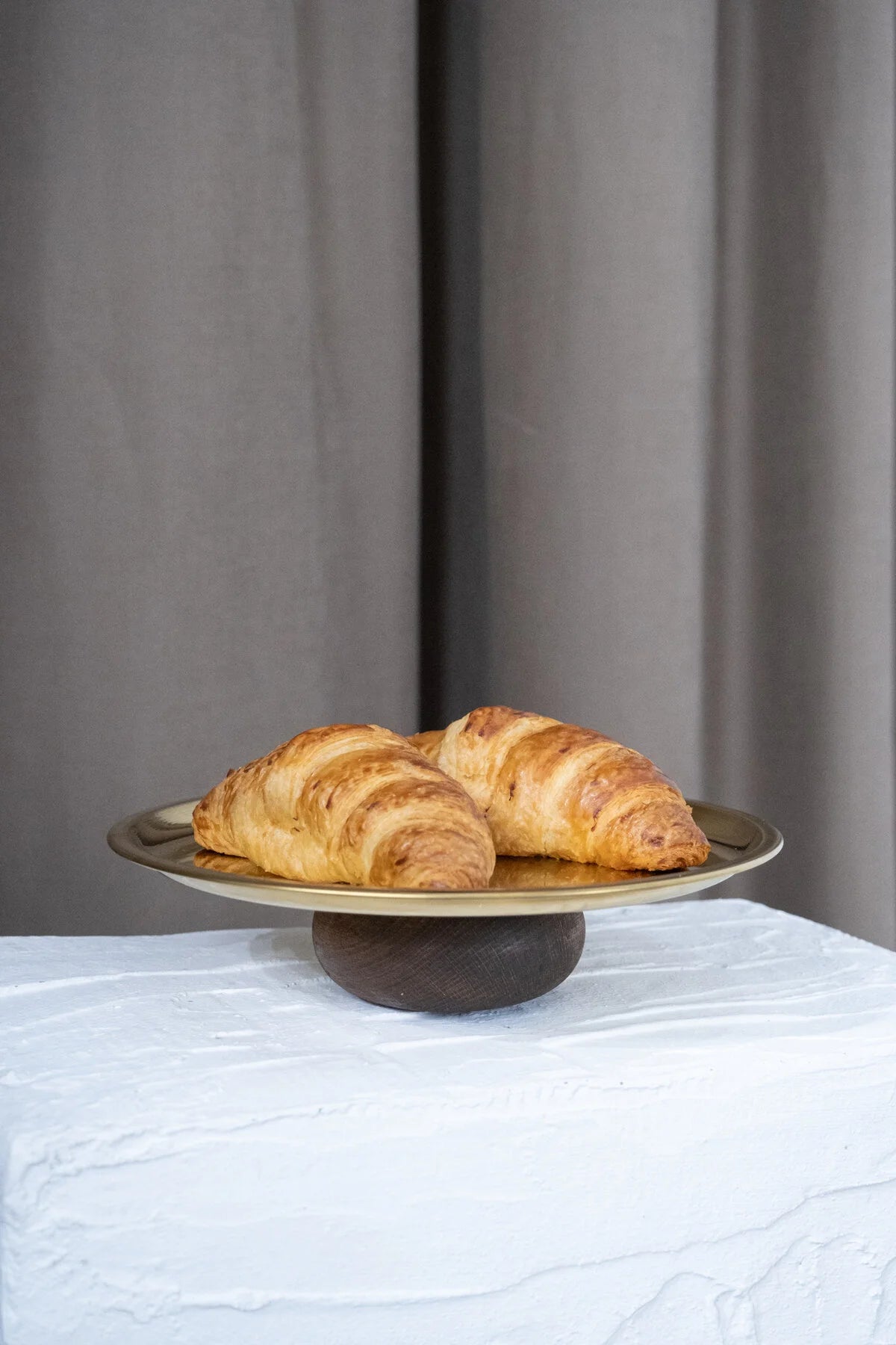 Altın renkli yuvarlak tabak ve doğal ahşap tabanı ile dikkat çeken bu sunum standı, hem estetik hem de işlevsel bir çözüm sunar.